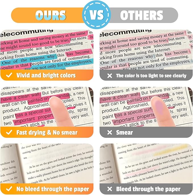 - No Bleed & Quick-Drying Highlighter: The highlighter pens use durable, quick-drying ink, allowing highlighted marks to be clearly visible without worrying about the ink staining your hands and books. Even when highlighting on one side of the page, the opposite side remains fully legible, eliminating the concern of ink seepage that could impair readability.