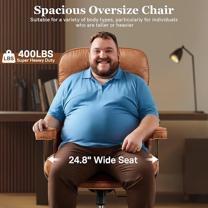 Mid Century Modren Big and Tall Office Chair,Large Ergonomic Executive Chair for Heavy Duty People, Computer Desk Task Chair with Wheels, Faux Lether Fabric Wide Chair for Home Sturdy,Brown(Suede)