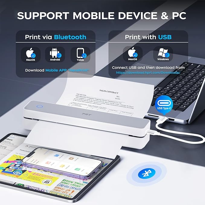 - 🥰User Friendly: When on the move, simplicity matters. Our portable thermal printer features a straightforward setup. The iOS and Android - compatible HerePrint mobile app enables easy Bluetooth connection for mobile printing, with options to adjust settings and preview documents. While laptop and PC users connect via USB. Don't let traditional printer limitations stop you; embrace the freedom of this user-friendly printer.