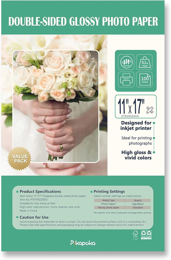- Pikapoka double-sided glossy photo paper 61lb(230gsm), size: 11x17 in, 100 Pack
