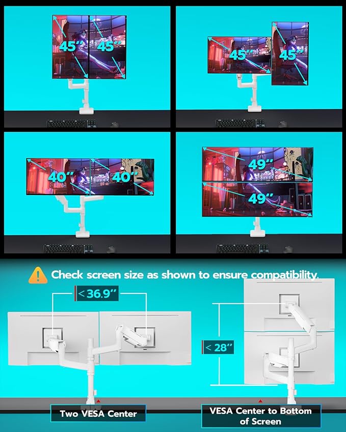 - 【Flexible Adjustment】The dual monitor arms adjust to a maximum height of 28.4 inches, with arms extending 21.8 inches. Featuring a stable premium gas spring and an upgraded head structure, it allows for -50° to +20° tilt, ±90° rotation, and 360° swivel. This monitor dual mount accommodates various screen layouts, optimizing your desktop space and providing an exceptional comfort experience for gaming or viewing.