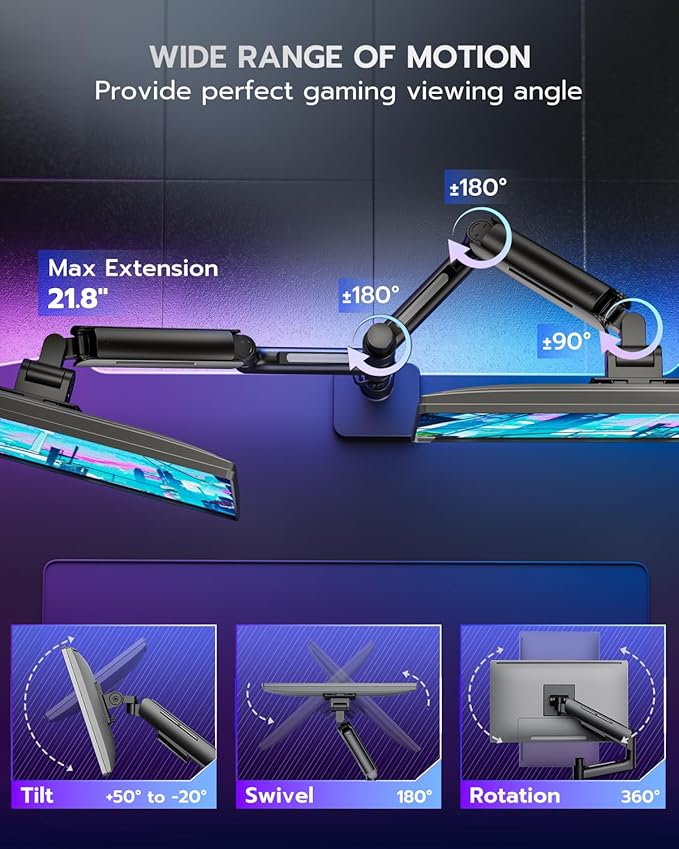 - 【Flexible Adjustment】The dual monitor arms adjust to a maximum height of 28.4 inches, with arms extending 21.8 inches. Featuring a stable premium gas spring and an upgraded head structure, it allows for -50° to +20° tilt, ±90° rotation, and 360° swivel. This monitor dual mount accommodates various screen layouts, optimizing your desktop space and providing an exceptional comfort experience for gaming or viewing.