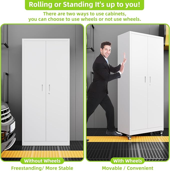 Aobabo 73''H Garage Storage Cabinet with Wheels,Office Storage Cabinet with Lock,Steel Cabinet with 2 Doors and 4 Adjustable Shelves for Garage Office,Required-Assembly White