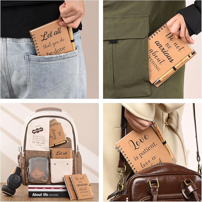 - Inspirational Scripture Notebook Set – This set includes 20 spiral notebooks and 20 bamboo pens, featuring 5 different Bible verses (4 notebooks and 4 pens per verse). A meaningful and practical bundle for note-taking, study, and gifting.