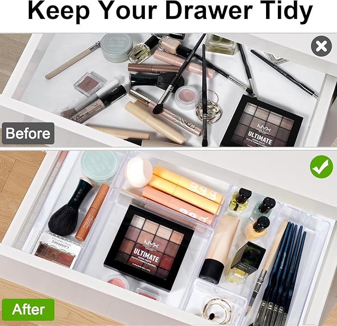 - Food-Grade Quality: This 6-piece drawer organizer set is made from premium, BPA-free, clear plastic, providing a durable and long-lasting solution for organizing your space. These organizers are built to last and keep your items tidy.