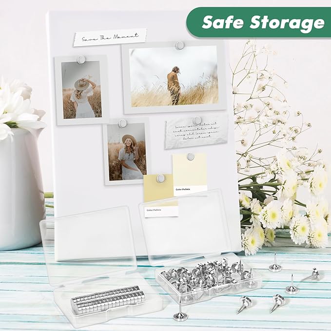 - 【Package Includes】You will get 36 sets of silver thumbtacks. A sufficient quantity can meet your different needs, and these are a great alternative to pins or tape. The pin part of the push pin is thicker and more sturdy than your standard push pins. In addition, the no magnetic thumbtacks and magnets are packed separately in two plastic boxes for your convenience in taking and storing.