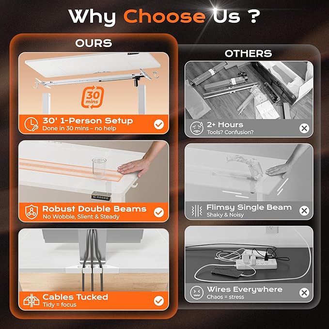 - 【Whisper-Quiet Operation】Powered by a robust yet quiet motor (operating at less than 45 DB), the wide deep desk brings smooth height adjustments without disturbing your household or office environment. This standup desk for home office is ideal for keeping focus and slient