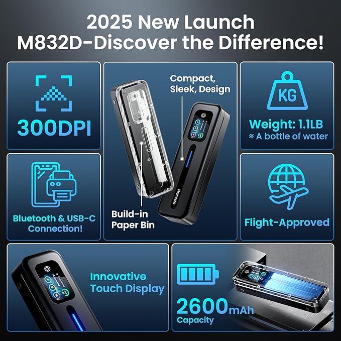 - Portable & Lightweight Design: Phomemo M832D compact printer weighs just 1.5lb, with a compact size that fits easily into your backpack, briefcase, or car. Optimized motor algorithms and refining the print head design reduce printing noise by 30%. The built-in 2600mAh battery allows for up to 200 pages of continuous printing on a single charge, making it ideal for on-the-go printing