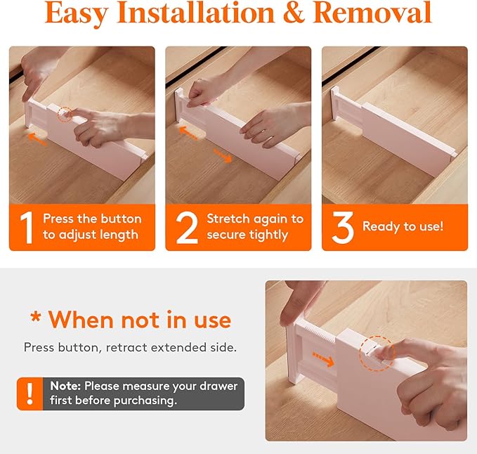 - Easy Installation & Removal: Press the top button to adjust the length before placing, and stretch it out again to secure it tightly before locking it. The strong spring tension keeps each drawer organizer securely upright. To retract, press the top button and push the stretched side