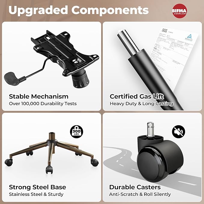 - Sturdy Construction: This padded task armchair features strong metal frame, curved backrest brackets that follow the curve of the human spine for stress relief, tested adjustment mechanisms and gaslift for stability even for tall and strong people, and high-quality 360° swivel rolling rotating casters avoid scratching the floor, can support up to 300 lbs. Whether you're working or relaxing, this modern chair offers a comfortable experience