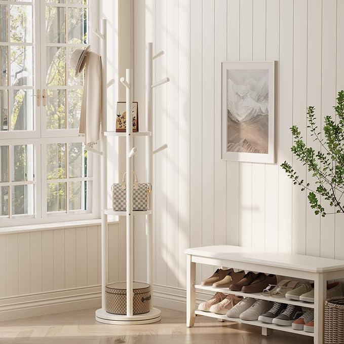 Solid Wood Rotary Coat Rack, Freestanding Coat Rack with 3 Shelves and 9 Hooks, Coat tree for Bedroom, Entryway, Livingroom, Coat Hanger Stand for Coats, Scarves, Handbags (White)