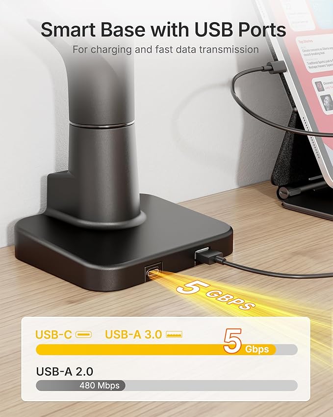 - 【Space-Saving Design】Designed for both convenience and organization, this ultrawide monitor arm features built-in USB-A 3.0 and USB-C ports for easy device charging and fast data transfer. The integrated cable management routes wires neatly along the arm, eliminating clutter and freeing up valuable desk space. Whether you're working or gaming, enjoy a cleaner desk space