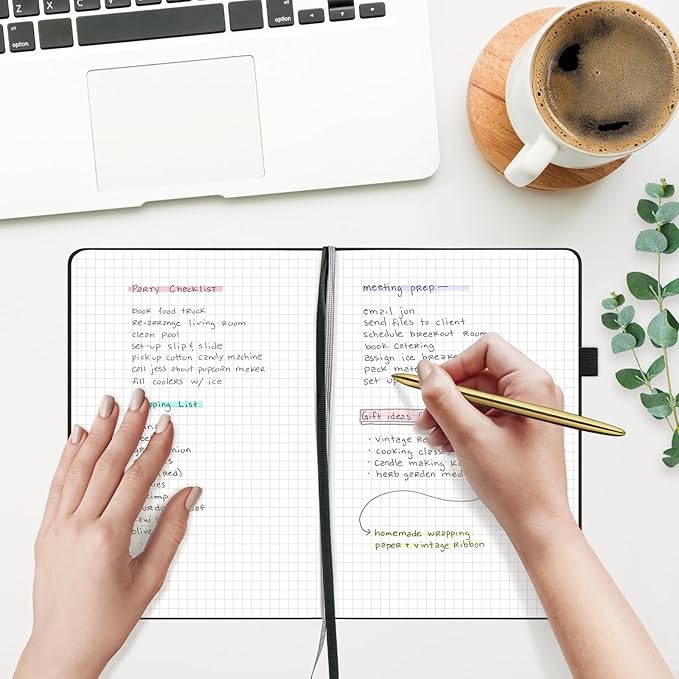 - DURABLE HARDCOVER: A durable vegan leather hardcover protects this notebook from wear and tear while providing a comfortable writing surface. An expandable back pocket holds notes, business cards, and small papers, and includes free sticker labels
