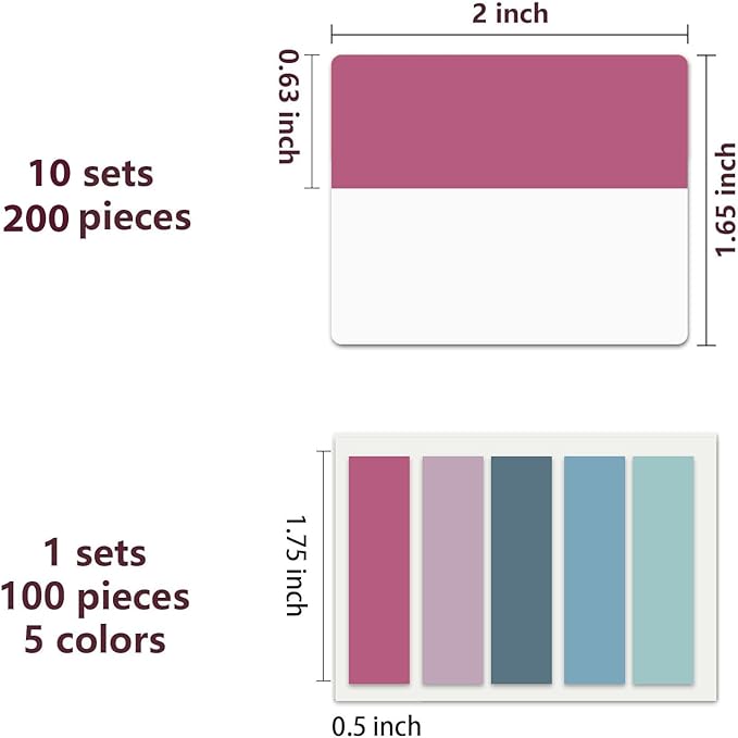 - 300pcs Book Tabs: 300 pcs 21 sets in total, 200 pieces 2 inch sticky tabs in 10 sets with different pastle colors,100 pieces 0.5 in tabs in 1sets, 20 pieces each color