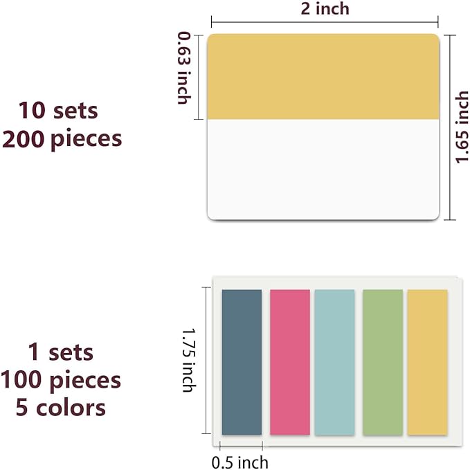 - 300pcs Book Tabs: 300 pcs 21 sets in total, 200 pieces 2 inch sticky tabs in 10 sets with different pastle colors,100 pieces 0.5 in tabs in 1sets, 20 pieces each color