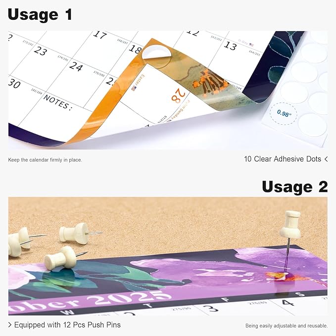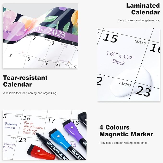 - ✨ Laminated Calendar with Dates: Waterproof wall calendar comes with a mini eraser, four dry-erase markers, 12 push pins, and 10 transparent round stickers. 12 months calendar covers the time range from July 2025 to June 2027, making it perfect for long-term use.