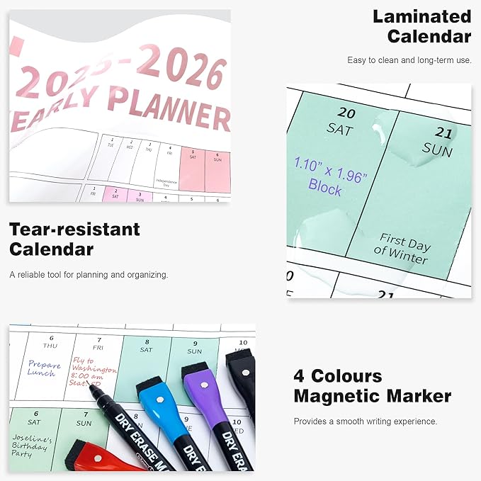 - ✨ Laminated Calendar with Dates: Waterproof wall calendar comes with a mini eraser, four dry-erase markers, 12 push pins, and 10 transparent round stickers. 12 months calendar covers the time range from July 2025 to June 2026, making it perfect for long-term use.