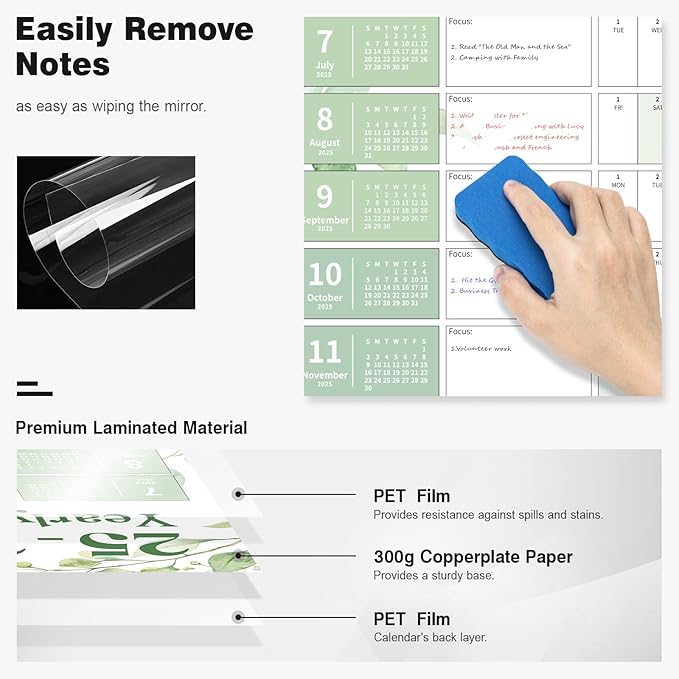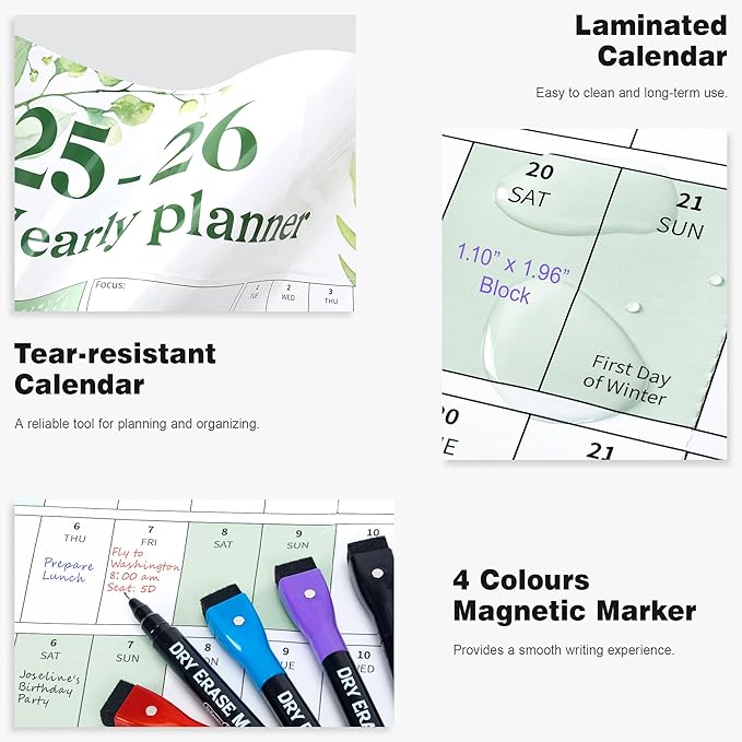 - ✨ Laminated Calendar with Dates: Waterproof wall calendar comes with a mini eraser, four dry-erase markers, 12 push pins, and 10 transparent round stickers. 12 months calendar covers the time range from July 2025 to June 2026, making it perfect for long-term use.