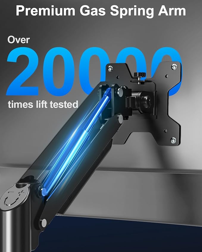 - Ergonomic Design - Features Features +70°/-45° tilt, ±90° swivel and 360° rotation, enabling seamless transitions between portrait and landscape modes to reduce neck strain. Equipped with a high-quality gas spring mechanism, which has undergone rigorous 2,000+ cycle testing to ensure smooth and reliable movement, this mount is ideally suited for multitasking professionals and gamers