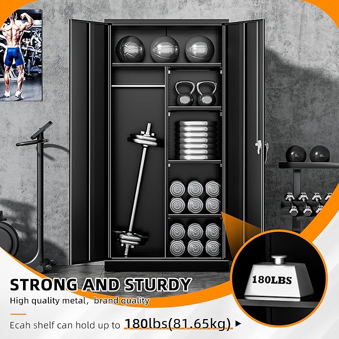 - 【Adjustable Large Space】: Locking metal locker cabinet is equipped with 4 adjustable shelves and a hanging rod, not only can be a storage cabinet, but also a clothes closet. The larger size (72” H x 32” W x16” D) is enough for your daily needs, and suitable for your office, bedroom, bathroom, basement, warehouse etc.