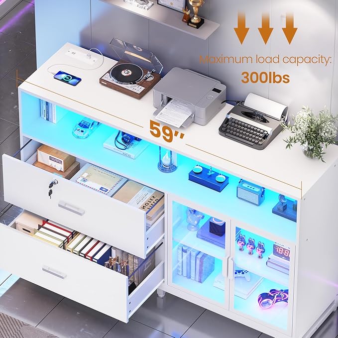 - πγWhat Can You Get?γ The file cabinet has 2 file drawers with 1 lock for Legal, Letter, A4 sizes standard file, power strip for charging 4 devices at the same time, spacious desktop(59"L) large enough for printers and scanners, 4 storage shelves, a pair of acrylic cabinet door for protecte documents and LED light. Filing cabinet that can be combined with any computer desk to form an L-shaped office area.