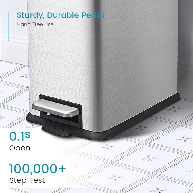 - 12 Gallon Step Trash Can: Our durable stainless steel foot pedal is built to last over 100,000 times, ensuring smooth and reliable operation for years to come.