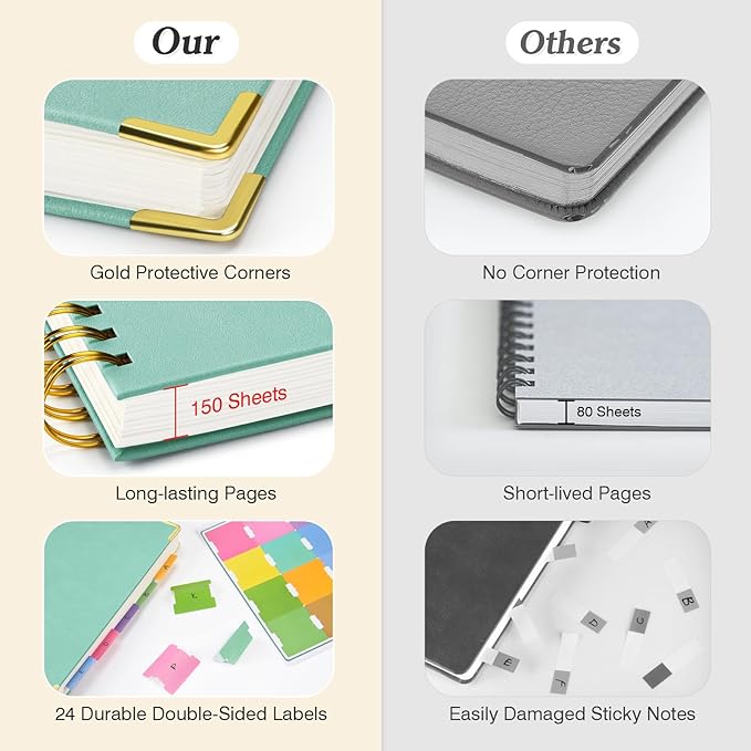 - 【Premium Leather Cover & Strong Binding】Spiral notebook showcases a luxurious leather hard cover, complete with golden corner protectors for extra durability. Its professional design not only looks stylish but is built to last. The strong metal double spiral binding allows for a full 360° lay-flat design, making writing more comfortable and efficient. Whether flipping through or laying the Subject notebook flat, this design guarantees a smooth writing experience.