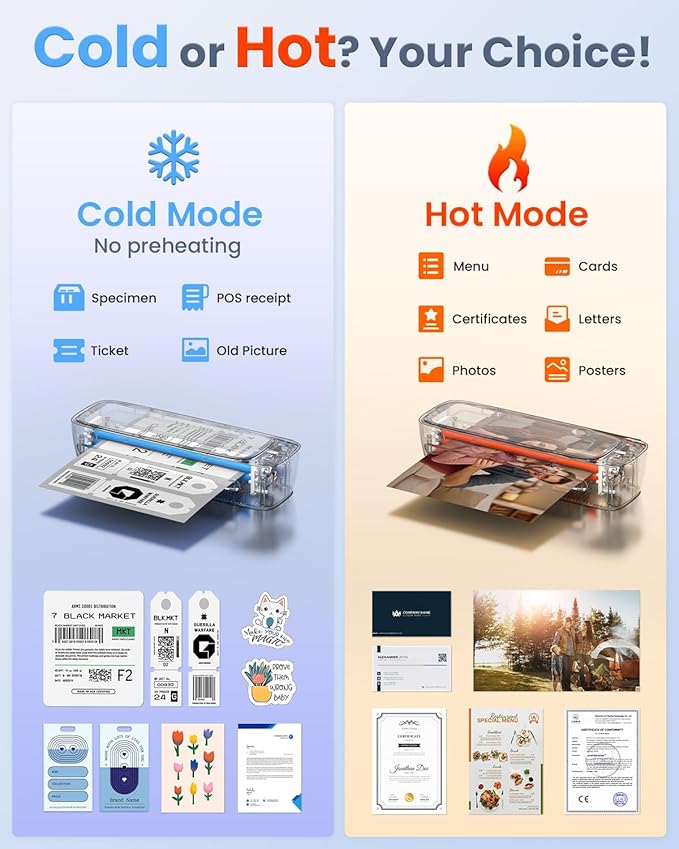 - Smart Hot & Cold Modes: thermal laminator seals at a constant 85ยฐC, creating a waterproof, scratch-resistant protective layer, ideal for thick paper, certificates, and long-term preservation. Cold mode bonds materials and film through mechanical pressure, preventing heat damage, perfect for sensitive items like photos, receipts, and labels. (Note: Cold mode requires self-adhesive pouches, not included.)
