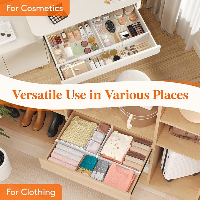 - Expandable and Adjustable: With a 0.4-inch (1cm) thickness and 3.1-inch (7.9 cm) height, plus an adjustable length of 10 to 16.9 inches (25.3 to 42.9cm), our drawer organizer fits most drawers. Please measure your drawer before purchasing