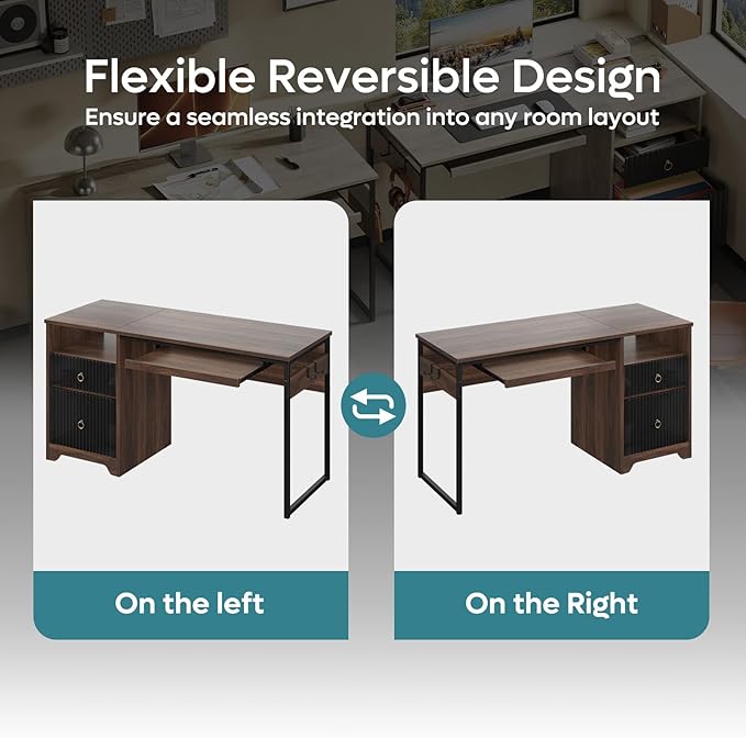 - User-Friendly Design: The home office desk features a flexible keyboard tray for comfortable typing. Its reversible pedestal can be installed on either the left or right side, ensuring seamless integration into any room layout. Additionally, two practical hooks provide convenient storage for headphones or other accessories