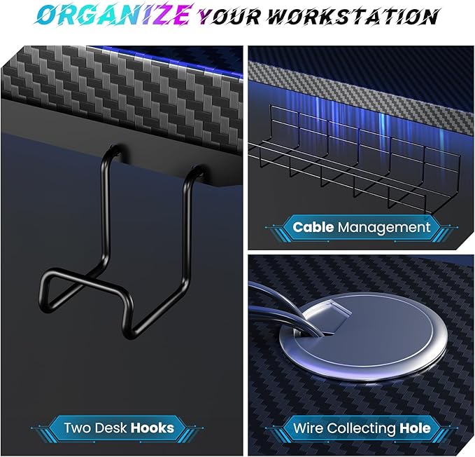 - Organize Your Workstation : 48"x24" eco-friendly desktop provides you with a spacious workspace. Integrated cable management tray and hooks for headphones or bags, ensuring a tidy workspace. Say goodbye to cable chaos and focus on what matters!