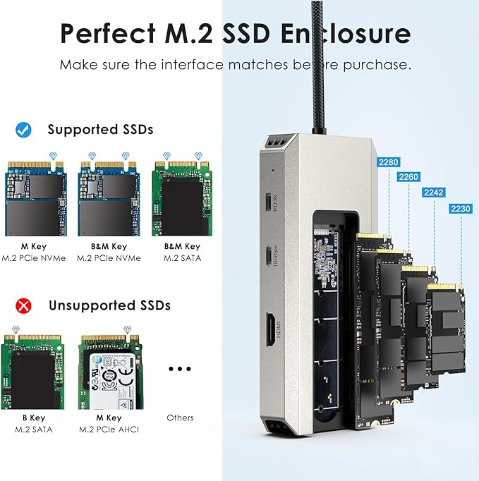 - Note: The Type-C port of your host should support video output and charging. Please use a 20V/5A/100W charger (not included). Only compatible with M.2 NVMe PCle M Key/B&M Key, M.2 SATA B&M Key; Not compatible with M.2 SATA B Key SSDs, mSATA SSDs or M.2 PCle AHCI SSDs. If you are using your M.2 SSD for the first time, you should format it before use. Only in this way can the SSD be recognized by computers.
