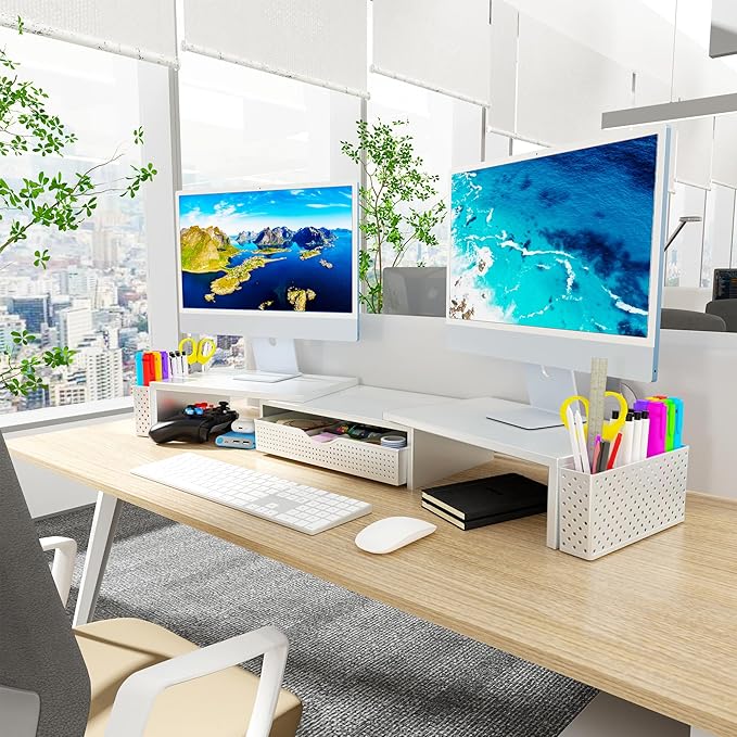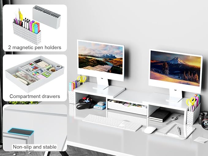 - Dual-screen office efficiency improvement: This desktop organizer is equipped with a dual-display stand, which can place two monitors at the same time, effectively expanding the workspace. It also has adjustable length (27.6-40.6 inches) and angle to provide you with a better viewing experience.