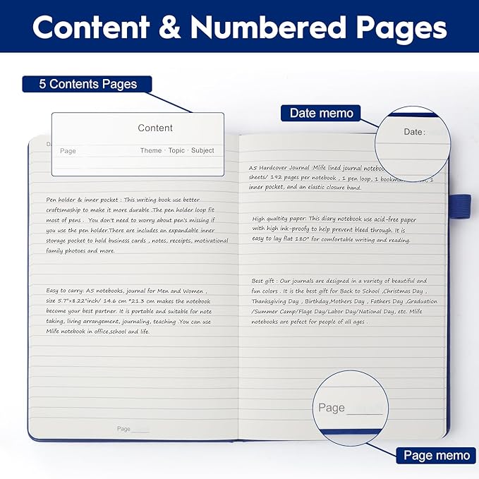 - 【Humanized Design】5 Contents Pages for detailed indexing. No more worrying about not having enough index pages; 1 Exquisite ribbon bookmarks to mark your place effortlessly; 1 Elastic closure band to keep your pages safe; 1 pen holder for convenient storage.; 1 Back Inner pocket for storing notes, receipts, or small items.