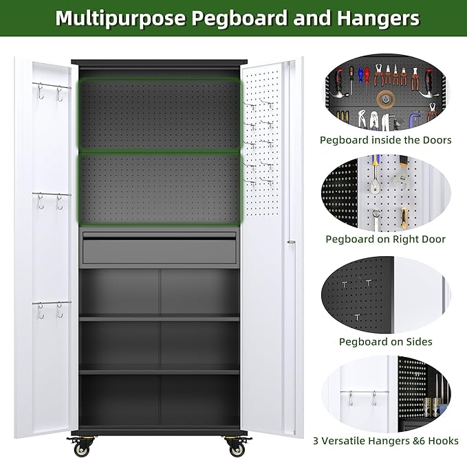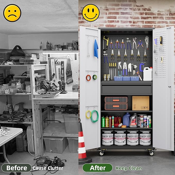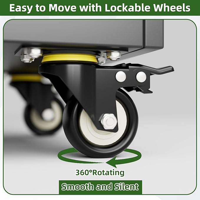 - [Swivel Wheels with Lock] Garage storage cabinet with Wheels has 4 lockable wheels,you can move them around as needed and the casters and wheels work great on all the different surfaces,besides the wheels can be locked and you can fix the cabinet where you want to place.