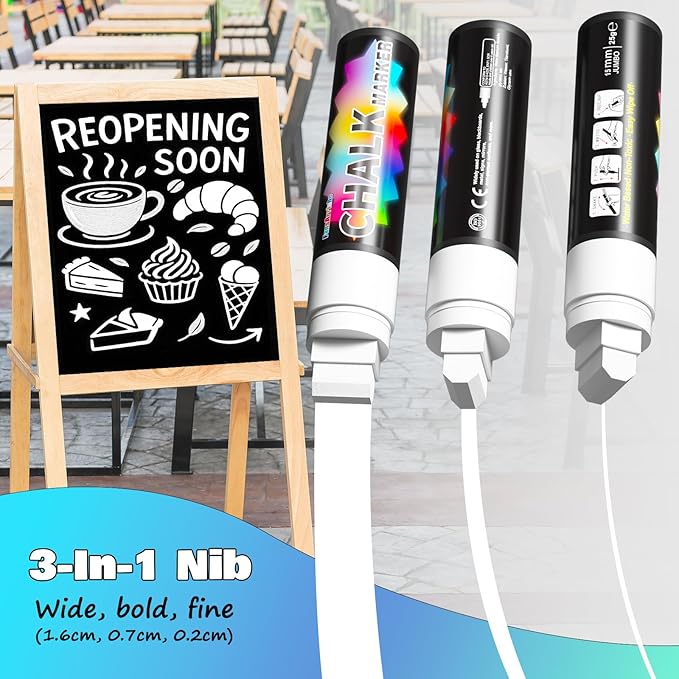 - Multi-Size: Liquid Chalk with a 3-in-1 nib, you can use the rectangular nib to create 3 styles - wide line, thick line, and thin line - for a variety of needs.