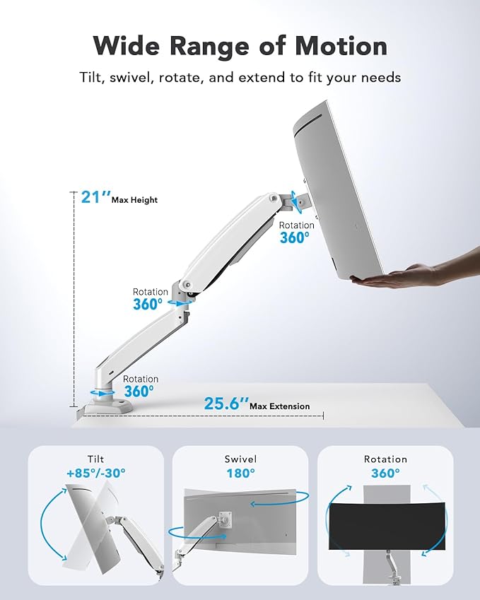 - FLEXIBLE ADJUSTMENT & ERGONOMIC DESIGN:Tilt (+85° to -30°), swivel (180°), and rotate (360°) your screen effortlessly. Ultrawide montior arm with 21.1" height adjustment and 25.6" extension range, it adapts to standing desks, gaming setups, or shared workstations—Meets optimal viewing comfort,work smarter and feel better every day.