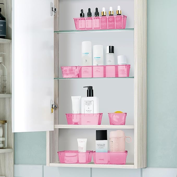 WOWBOX 25 PCS Plastic Drawer Organizer Set, 4 Sizes Desk Drawer Divider Organizers and Storage Bins for Makeup, Jewelry, Gadgets for Kitchen, Bedroom, Bathroom, Office, Clear Pink