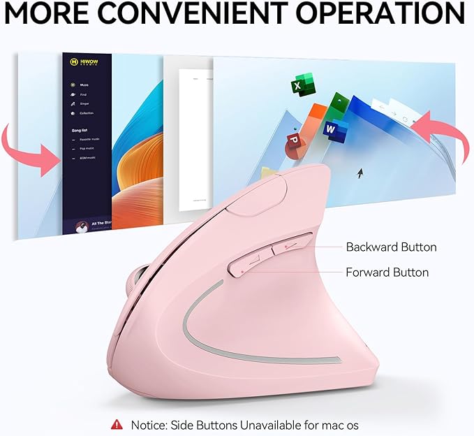 - 【Ergonomic Design】The wireless mouse's ergonomic design offers ultimate comfort by placing your palm at a near-vertical angle on the desktop, reducing pressure and pain on your wrist caused by prolonged inverted mouse usage (Note: Mouse is designed for right-handed use only).