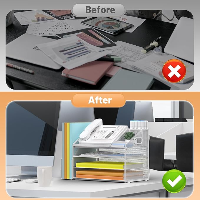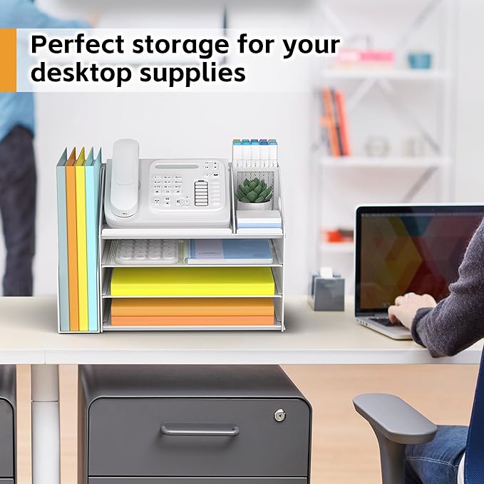 - 4 Tier Organization with Pen Holder: This White desk organizer boasts a 4-tier design for efficient sorting of your papers, letters, and other office supplies, along with a dedicated pen holder. It's perfect for maintaining a tidy and uncluttered workspace. The desk file organizer is an essential desk accessory that contributes to an orderly and professional atmosphere