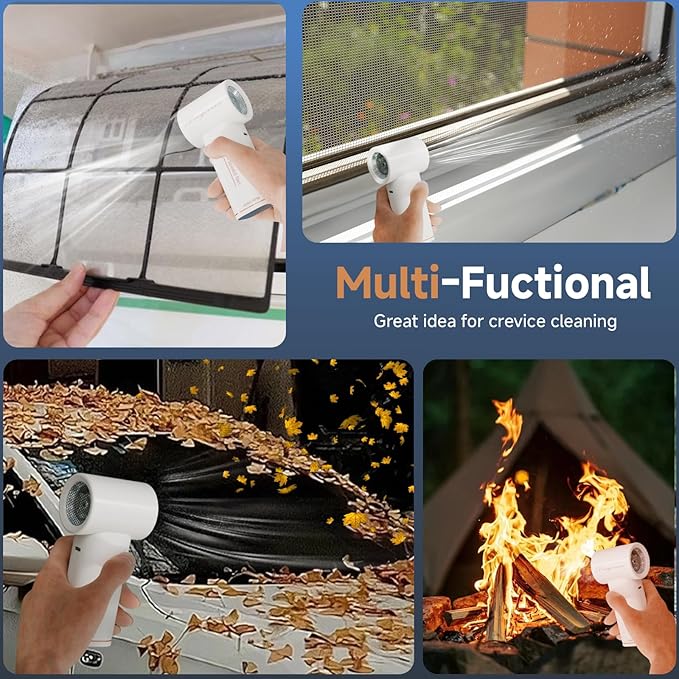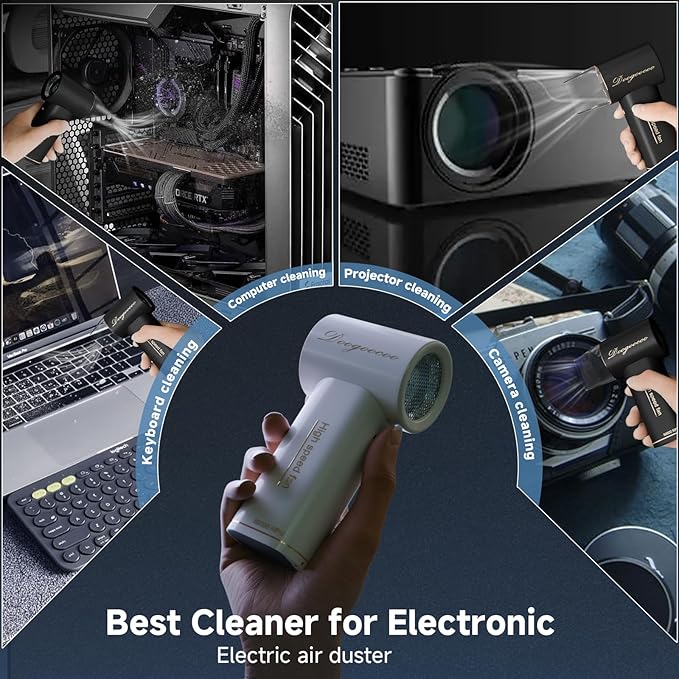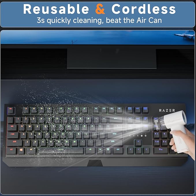 - [Upgraded MINI Compressed Air Duster] - Made with industry-leading 3C power battery technology. The power increased by 30%, durability increased by 100%, and usage time increased by 200%; Besides, this electric cordless air blower has 5 gears adjustable. The size of only 5.1x2.4in and a weight of 398g. It is small and lightweight but powerful efficiently dust cleaning for computer, keyboard, air conditioner, home, car and outdoor. BTW, it also can make a fire.