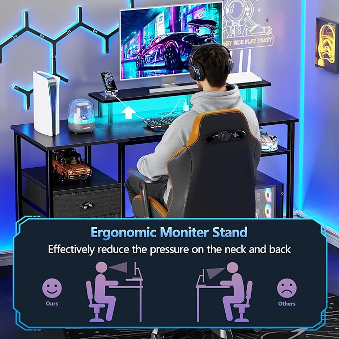 Furologee 51" Gaming Desk with Power Outlets & LED Lights, Reversible Computer Desk with File Cabinet & Monitor Stand for Home Office, Large Work Table with Storage Shelves & Drawer, Black