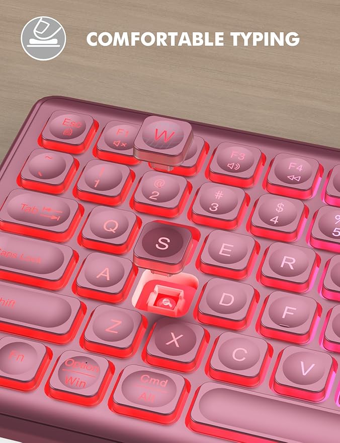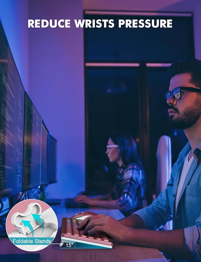 - COMFORTABLE TYPING & SILENT CLICK - The foldable stands offer a tilt angle for a better typing position. The effortless crater mechanism under each key makes typing more comfortable. The mouse and keyboard are almost silent, don't worry about disturbing others.