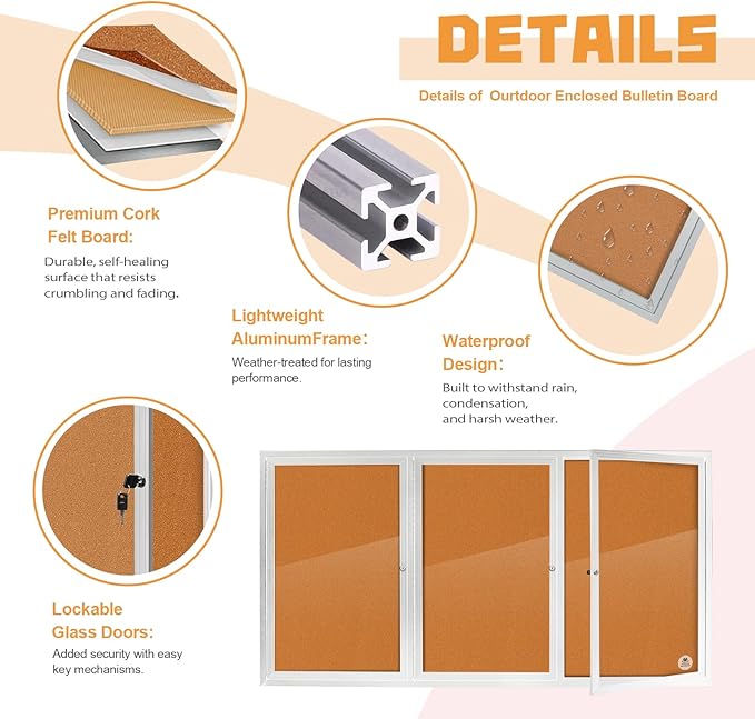 - Lockable Outdoor Bulletin Board for Secure Messaging - Designed as a lockable bulletin board, it comes with a locking door and keys to protect your content from tampering, theft, and weather exposure. This outdoor bulletin board weatherproof is ideal for semi-outdoor locations such as school entrances, building lobbies, or covered exteriors.