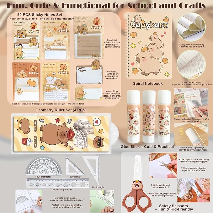 - Perfectly Crafted for a Joyful Childhood! Our adorable Capybara stationery set includes: 4 document folders, 1 spiral notebook, 1 pencil case, 1 4-piece ruler set, 6 mechanical pencils, 4 black gel pens, 3 glue sticks, 2 erasers, 1 sticky notes pad (90 sheets), 10 gel pen refills, 1 box of pencil leads, and 1 pair of cute scissors. Cute and practical—perfect for brightening every school day!