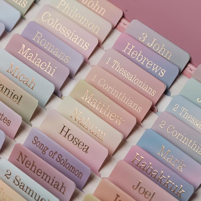 - Unique: Bible tabs with summary descriptions and Rainbow Gold Foil Embossed Lettering.This is the ideal christian gi.ft. These unique Bible index tabs make a great gi.ft for your girlfriend, mum, kids, or anyone who loves beautiful things in life.