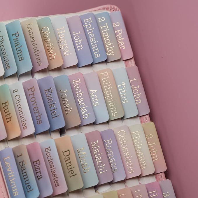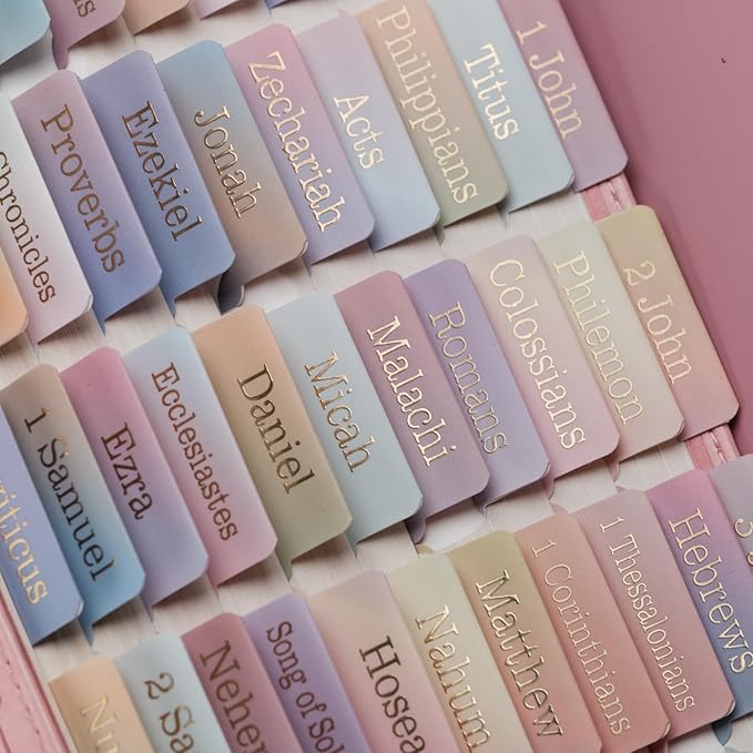 - Large Print, Easy to Read & Easy to Install:Silky velvet touch laminate,carefully designed pretty Bible accessories . The peel-and-stick Bible index tabs are self adhesive, simply align them with the provided guide or place them creatively.