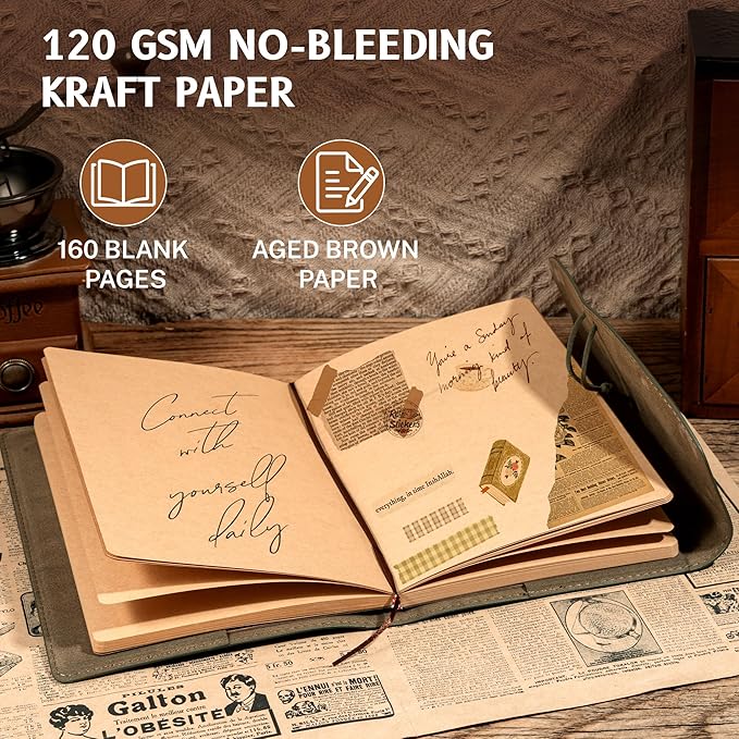 - PREMIUM KRAFT PAPER: The leather journal is made of 120 GSM aged brown colorkraft paper, which complements the cover. 160 pages sturdy blank paper for a smooth creative experience and not easy to bleed and ghost.