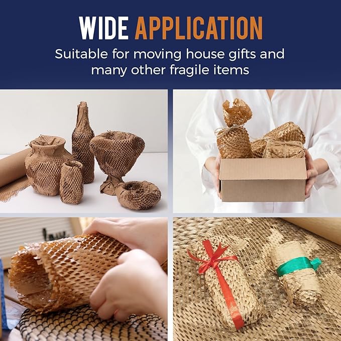 - Certified FSC C204227 Eco Friendly Shipping Supplies: Say goodbye to large bubble wrap roll! Our honeycomb wrapping paper for moving essentials offers an eco-conscious alternative. Crafted from 100% recyclable packing materials. This gentle packing paper sheets for moving keeps your items safe in transit