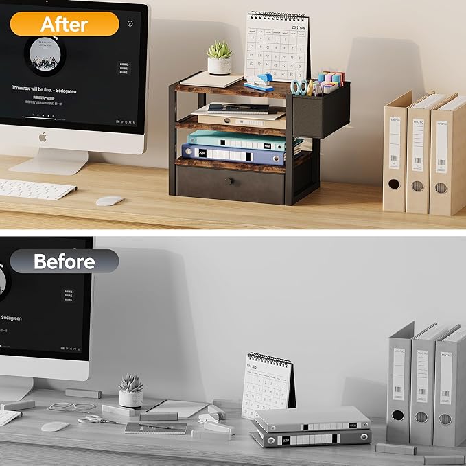 - 【Stylish Desktop Storage Solution】This desktop organizer features 3-tier wooden trays (the middle one slides) with a fabric drawer and three pen holders, offering generous storage for all your office supplies and desk accessories while maintaining an orderly workspace.